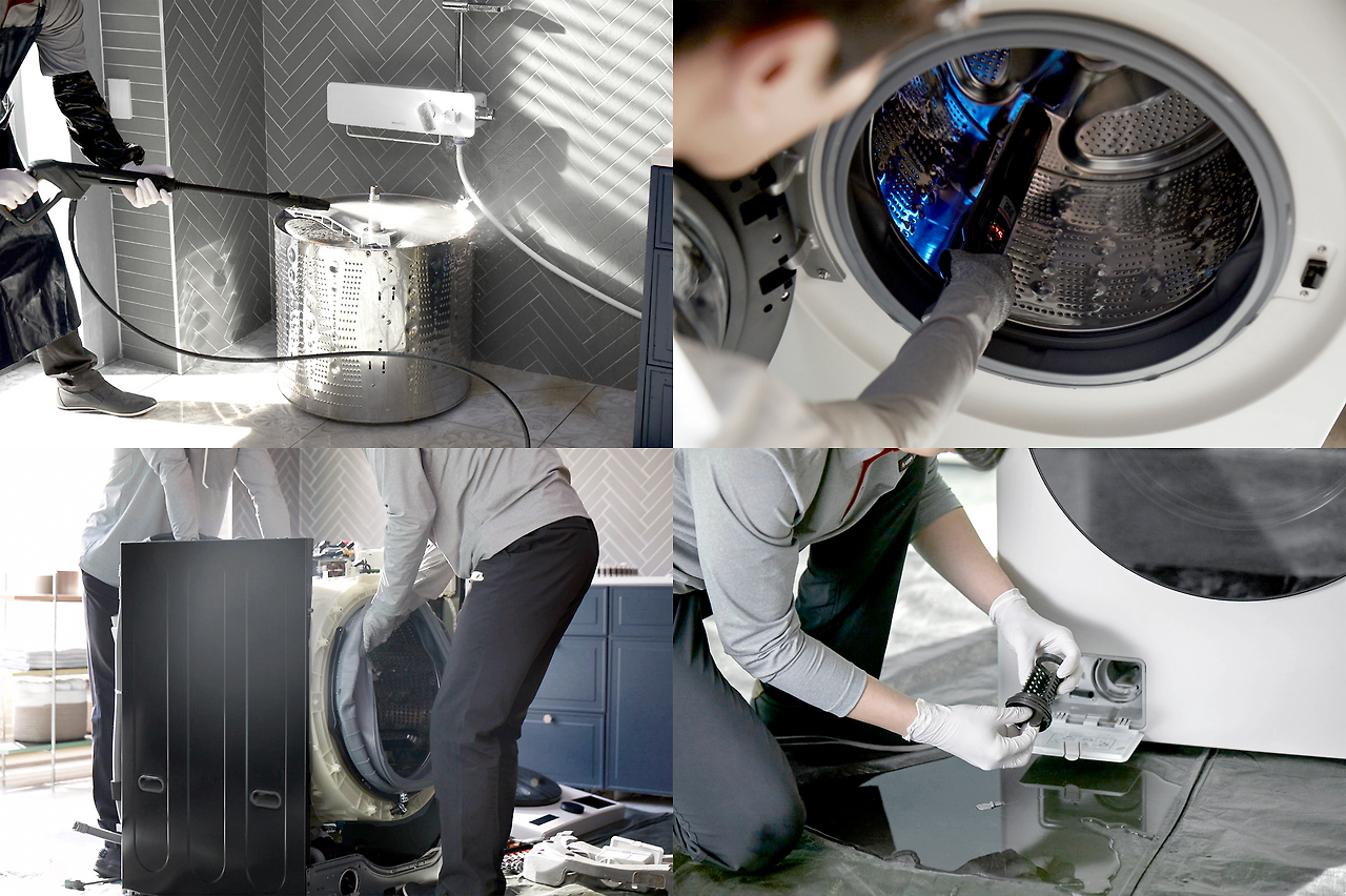 LG전자는 세탁기 케어를 강화하기 위해 세탁조를 분해한 후 고압 세척을 진행하고, 고온 스팀과 UV 자외선을 활용해 살균 처리를 합니다.